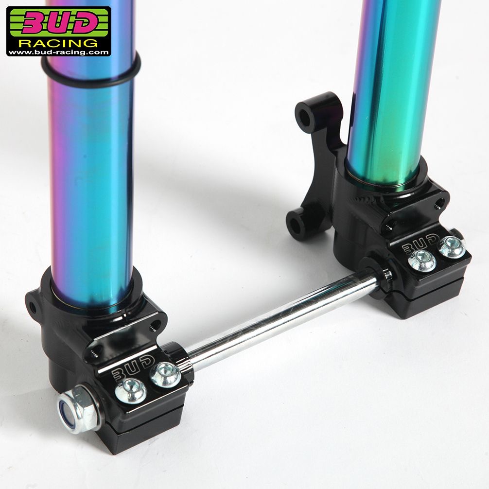 Complete Bud racing inverted front forks, 100% adjustable compression & rebound, Rainbow coated fork tubes delivered with complete triple clamps set
